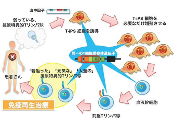 私たちの体内には様々な役割の免疫細胞が存在し、極めて巧妙なネットワークを形成して、微生物などの”外敵”や、がん細胞などの”内なる敵”との戦いを日夜繰り広げています。免疫関連疾患は、この免疫システムの不全や破綻により発症します。これに対し、以前よりワクチン療法などによる免疫システムの補強が試みられてきましたが、その応用は感染症(外敵)を中心とした予防医療にとどまっていました。一方、近年、免疫細胞の生物学的理解と遺伝子工学技術が進んだ結果、がん細胞や異常をきたした免疫細胞など(内敵)に対抗する真に有用な免疫治療がいくつも登場しています。私たちは、iPS細胞を中心に据えたアプローチで、それら成果をさらに推し進めるべく、新しい免疫再生の技術開発と免疫再生治療の臨床応用に取組んでいます。